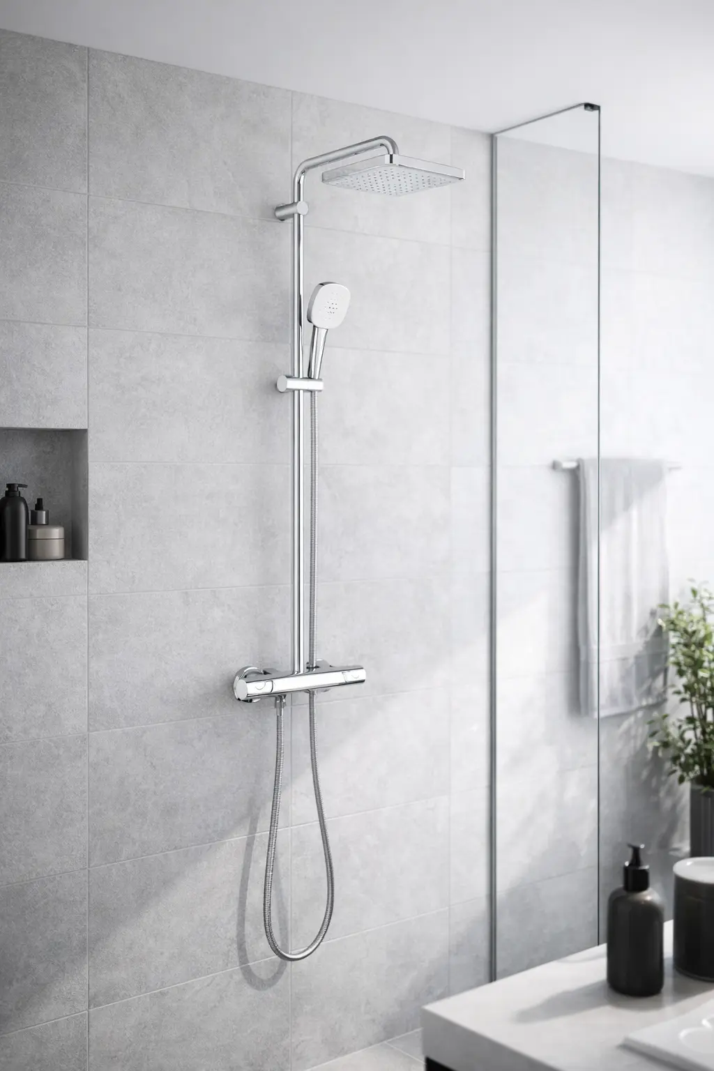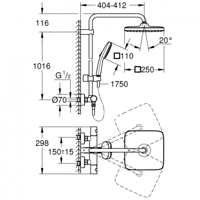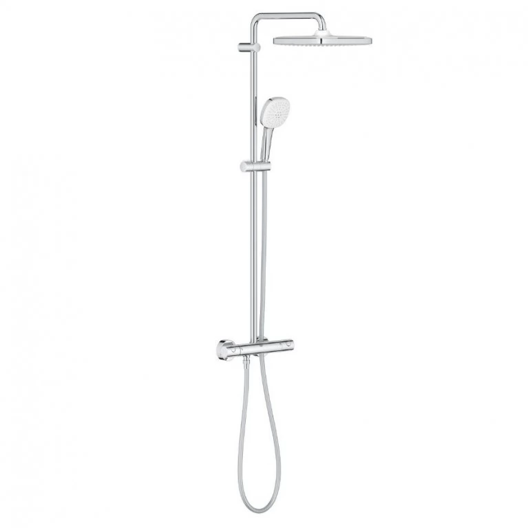 Душова система з термостатом для настінного монтажу Grohe Tempesta System 250 Cube — це поєднання сучасного дизайну, інноваційних технологій та максимального комфорту під час щоденного використання. Верхній душ діаметром 250 мм забезпечує рівномірний і приємний потік води, створюючи ефект тропічного дощу, а ручна лійка додає зручності для індивідуального використання. Вбудований термостат автоматично підтримує стабільну температуру води, захищаючи від різких перепадів і забезпечуючи безпечний душ для всієї родини. Хромоване покриття GROHE StarLight стійке до подряпин і зберігає блиск на довгі роки, а технології GROHE DreamSpray та SpeedClean гарантують рівномірний розподіл води та легке очищення від вапняного нальоту. Система ідеально підходить для сучасних ванних кімнат, забезпечуючи комфорт, надійність і преміальний вигляд.