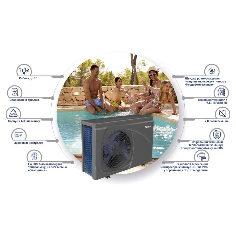 Низький рівень шуму (інтенсивність звуку). У насосах Altec Pool використовуються малошумні компресори GMCC та вентилятори з регульованою швидкістю. Робота пристрою за підтримки заданої температури води з ККД 50% приблизно в 7 разів тихіше, ніж у класичних теплових насосів On/Off.