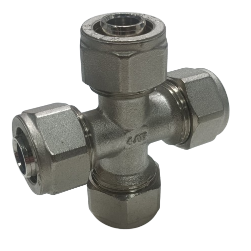 Хрестовина 20 мм виготовлена з високоякісної латуні, що забезпечує довговічність, стійкість до корозії та надійність у роботі. Призначена для підключення металополімерних труб у чотирьох напрямках, що робить її зручною при монтажі розгалужених систем холодного й гарячого водопостачання, а також опалення. Забезпечує герметичність та міцність з’єднань навіть за високого тиску.