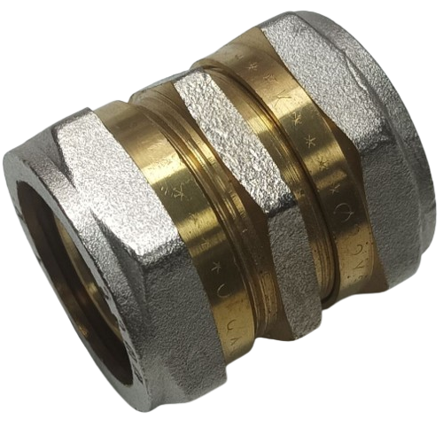 Муфта обтискна 32 х 32 виготовлена з нікельованої латуні, що забезпечує високу міцність, стійкість до корозії та довговічність. Призначена для прямого з'єднання металополімерних труб одного діаметра в системах холодного й гарячого водопостачання та опалення. Забезпечує надійне, герметичне та розбірне з’єднання.