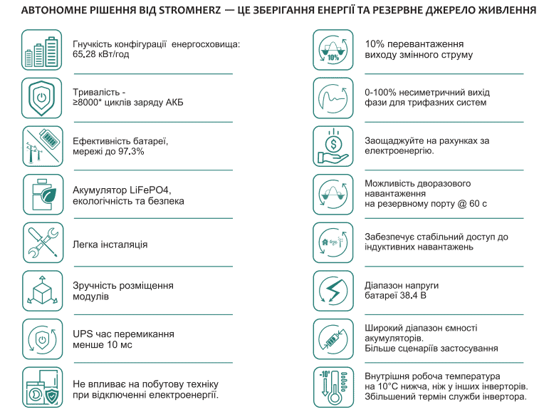 Комерційна система акумулювання енергії S-50K-3Р-40А-ESS-UA (GEN3) 65,28 кВт від провідного австрійського виробника Stromherz це інтелектуальні гібридні системи збереження енергії великих об’ємів, які перетворюють енергію сонця в акумулятори на цілодобовий ресурс, одночасно пропонуючи резервне живлення у разі збою в електромережі. Stromherz зберігає, знижує витрати на енергію, покращує стійкість мережі.