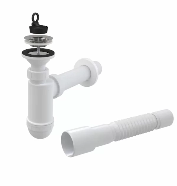 Сифон для умивальника AlcaPlast DN40 з решіткою з нерж. сталі DN63 має підключення до каналізаційної труби Ø40 мм. В комплект входить: корпус сифона, пробка з ПВХ, зливна решітка з нержавіючої сталі і гнучке з'єднання 50/40 x 40.