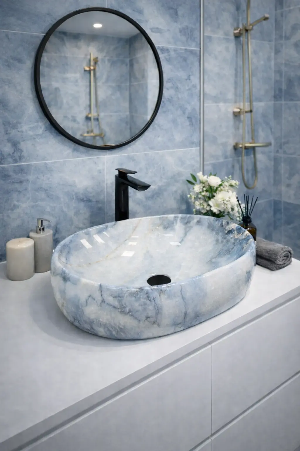 Умивальник накладний VBI VENETO GRANIT GLOSSY — стильна сучасна раковина, яка стане ефектним елементом інтер’єру ванної кімнати. Модель виконана у витонченій овальній формі та має декоративне покриття з імітацією натурального граніту, що надає виробу елегантного та дорогого вигляду. Глянцева поверхня красиво відбиває світло, підкреслюючи текстуру та глибину малюнка, а також полегшує догляд за умивальником. Раковина призначена для встановлення на стільницю або меблі для ванної кімнати й чудово поєднується з високими або настінними змішувачами. Завдяки якісній сантехнічній кераміці умивальник стійкий до подряпин, перепадів температур і зберігає бездоганний вигляд протягом тривалого часу.