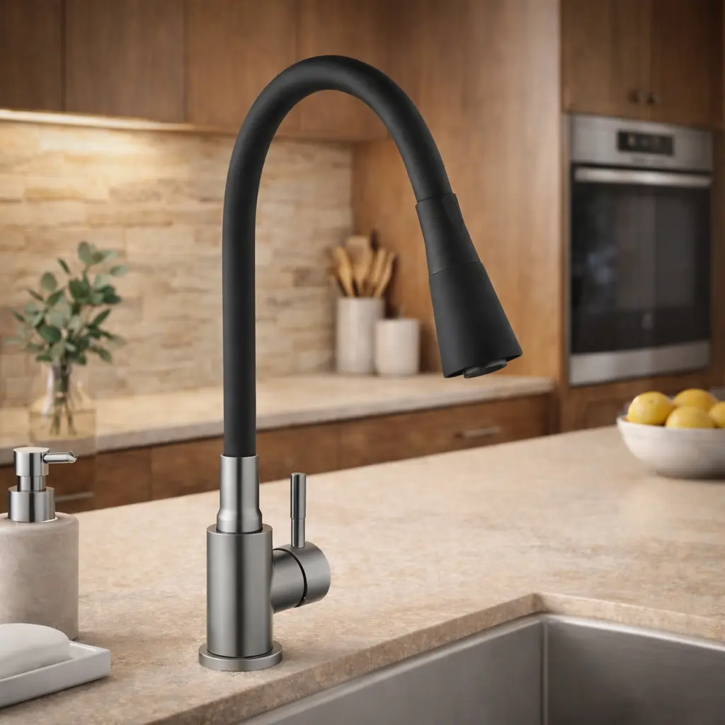 Змішувач для кухні Kroner KRP Edelstahl Klassisch - PVD031BLK — стильна модель у класичному виконанні з сучасним чорним PVD-покриттям, яке забезпечує підвищену стійкість до подряпин, корозії та втрати кольору. Виготовлений із нержавіючої сталі (Edelstahl), змішувач відзначається міцністю, довговічністю та безпечністю для питної води. Зручний вилив забезпечує комфорт під час миття посуду й наповнення великих ємностей, а надійний механізм керування гарантує плавне регулювання температури та напору води. Kroner KRP Edelstahl Klassisch - PVD031BLK стане ефектним акцентом сучасної кухні та практичним рішенням для щоденного використання.